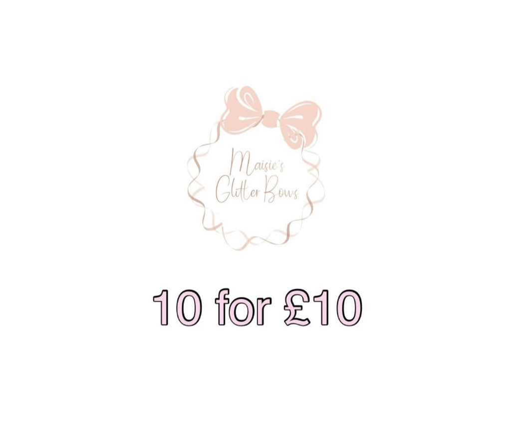 You will receive 10 surprise bows for £10, in a range of fabrics and different sizes, 1 clay bow will be included
